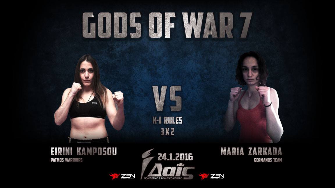 Δεύτερο ζευγάρι αυτό στα 55 kg με τη Μαρία Ζαρκάδα του Βασίλη Στριγκλογιάννη όπου θα βρει απέναντι της μία νέα στα Αθηναϊκά δρώμενα αλλά πολύ δυνατή αθλήτρια , την Ειρήνη Καμπόσου του Χρήστου Γαλάζιου από την Πάτμο . Οι δυο αθλήτριες ξαναβρέθηκαν μεταξύ τους στο Gods of War Open , όπου και έκαναν έναν πολύ δυνατό αγώνα . Η Μαρία Ζαρκάδα έρχεται με όρεξη μετά από την νίκη της απέναντι στη Χαρά Δημητρούλα στο τελευταίο GOW , ενώ η Ειρήνη αγωνίστηκε πρόσφατα στο Κ-1 Open στην Ιταλία όπου και κατέκτησε το χάλκινο μετάλλιο σε μια δυνατή κατηγορία.