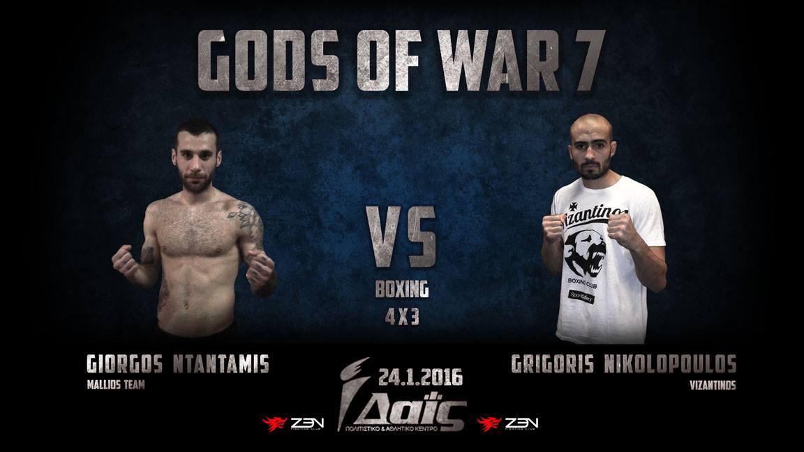 Στην κατηγορία των 69 kg θα αγωνιστούν δυο ανερχόμενοι και γνώριμοι σε μας αθλητές από το Gods of War Master edition, όπου είχαν προσφέρει πλούσιο θέαμα. Ο Γιώργος Νταντάμης , αθλητής του Γρηγόρη Μάλλιου θα αγωνιστεί σε τέσσερις γύρους των τριών λεπτών απέναντι στον Γρηγόρη Νικολόπουλο, αθλητή του Χρήστου Γάτση, ενώ εμείς αναμένουμε με ανυπομονησία τη ρεβάνς .