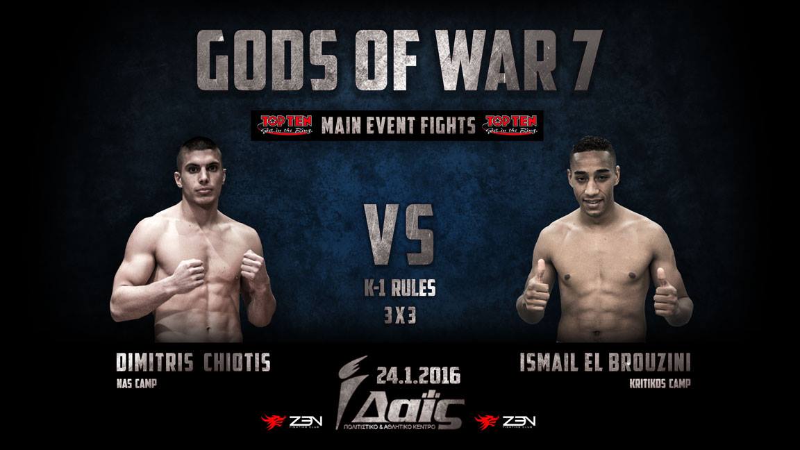 Ο Δημήτρης Χιώτης με προπονητή το Νάσο Αργυρόπουλο και έχοντας ολοκληρώσει τη στρατιωτική του θητεία, επανέρχεται μετά από νικηφόρο αγώνα σε διοργάνωση στο εξωτερικό και θέλει να ξεκινήσει με το δεξί το 2016. Απέναντί του ο Ισμαήλ Ελ Μπρουζίνι , με προπονητή το Νίκο Κρητικό και ένας από τους καλύτερους αθλητές για τη σεζόν που μας πέρασε , με αγώνες μόνο σε main event και με διαρκώς ανερχόμενη πορεία.